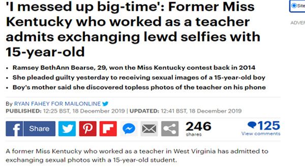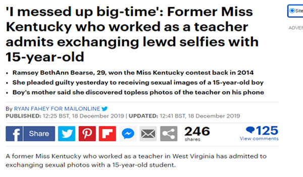 وأقرت رمزي بيثان بيرس، مدرسة العلوم السابقة، الفائزة بلقب جمال كنتاكي في عام 2014، بإرسال صور عارية إلى الطالب، حيث اعترفت بالذنب في تهمة واحدة هي حيازة مواد تصوير لقاصرين في سلوك جنسي صريح.