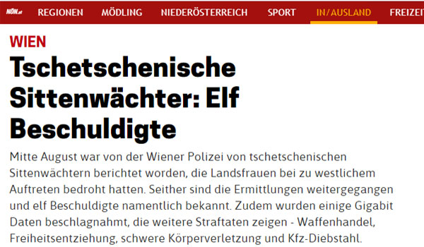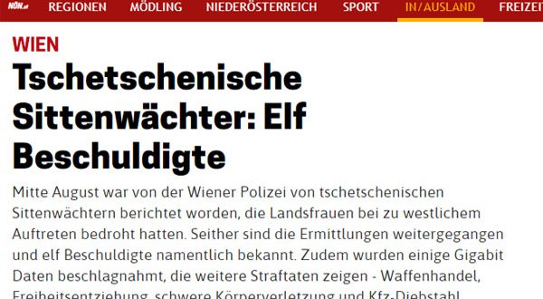 تواصل أجهزة الامن النمساوية التحقيق فى قضية التجمع الذي يتكون من 11 شيشانيًا – بينهم امرأة واحدة – أطلقوا على انفسهم اسم ” حراس الاخلاق ” وقاموا بارهاب العديد من النساء الشيشانيات بعد اتهامهن بأنهن أصبحن غربيات ويسلكن كما تسلك الاوروبيات .