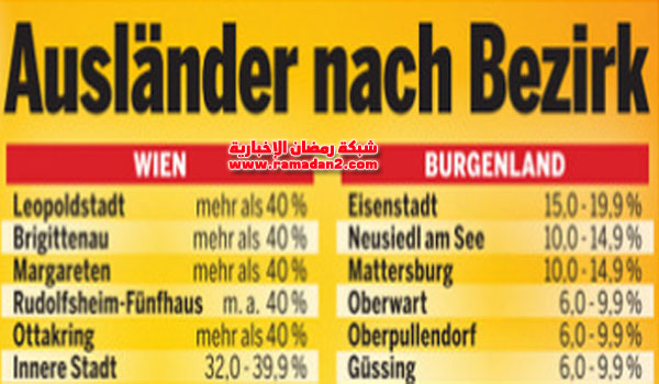 كشفت احدث الاحصائيات تطورات التركيبة السكانية فى النمسا وسط انشغال وقلق مجتمعي من ارتفاع اعداد الاجانب ، حيث ارتفع عدد سكان النمسا إلى 8.9 مليون نسمة بنسبة نمو 0.5 في المائة على أساس سنوي . وقال البيان الصادر عن هيئة الاحصاء النمساوية ، أن عدد السكان في العاصمة فيينا ارتفع بنسبة 0.8 في المائة لبصل إلى نحو 9ر1 مليون نسمة ، وأن نصف سكان العاصمة تقريباّ حتى عام 2019 ينحدرون من أصول أجنبية ، وأن الأجانب الذين يسكنون العاصمة يساوى الضعف مرتين مقابل كل الأجانب الذين يعيشون فى كل النمسا .