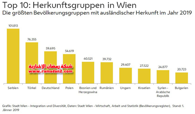 وأكد البيان ان الصرب احتفظوا بمركزهم كأكبر الجاليات الأجنبية في فيينا ، وجاء الأتراك في المركز الثانى ، ثم جاء الألمان في المركز الثالث ، تلهم الرومانيين والبولنديين ثم البوسناويين ، بينما انخفض عدد الأفغان بنسبة 5.9 في المئة والمجريين بنسبة 5.2 في المئة