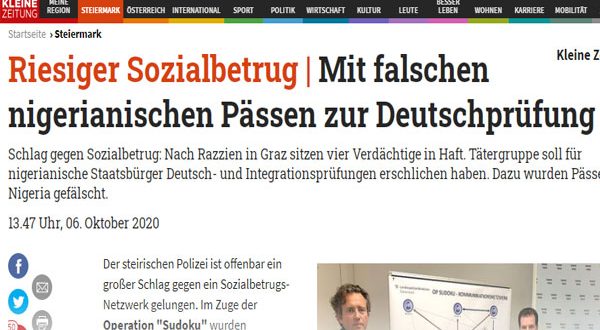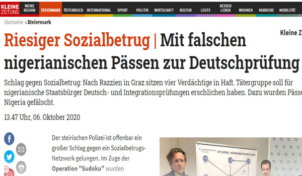 ألقت شرطة مدينة جراتس عاصمة ولاية إشتاير مارك النمساوية القبض على أربعة أشخاص تمكنوا من أجراء بعض أمتحانات اللغة الألمانية الخاصة بالحصول على الجنسية النمساوية ، مقابل مبالغ مالية متفق عليها قبل دخول الأمتخانات ، بجانب أختبارات أخرى للغة الخاصة بالمساعدات الاجتماعية المادية والعينية ، التي تتطلب الحصول على مستوى معين من اللغة الألمانية على سبيل المثال يكون المتقدم حاصل على مستوى لغة “B1” مثلاّ ، وقد رصدت شرطة جراتس أكثر من 70 عنصر شرطي لألقاء القبض على هذه المجموعة وقد تمكنوا من القبض عليهم يوم أمس الثلاثاء الموافق 6 من أكتوبر 2020 .