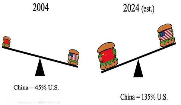 باختصار، كان المعيار القياسي الذي اعتاد معظم الأمريكيين على إظهاره أن الاقتصاد الصيني أصغر بمقدار الثلث من الولايات المتحدة، لكن عندما يدرك المرء حقيقة أن دولاراً واحداً في الصين يشتري ما يقرب ضعف ما يشتريه في الولايات المتحدة، فإن الاقتصاد الصيني اليوم هو أكبر سدساً من الاقتصاد الأمريكي.