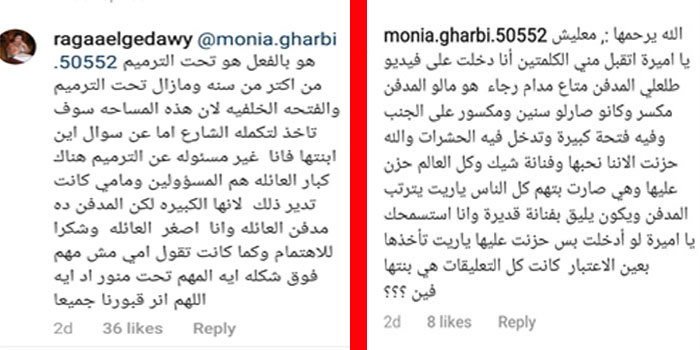 وقالت المتابعة إنها رأت فيديو لمقبرة الراحلة رجاء الجداوي وهو محطم من الداخل وتدخله الحشرات وقالت “الله يرحمها، معلش يا أميرة تقبلِ مني الكلمتين، أنا دخلت على فيديو طلعلي المدفن بتاع مدام رجاء، هو مالو المدفن مكسر وكأنو صار له سنين، ومكسور على الجنب وفيه فتحة كبيرة وتدخل فيه الحشرات، والله حزنت لأننا نحبها وفنانة شيك وكل العالم حزن عليها، وهي صارت بتهم كل الناس، ياريت يترتب المدفن ويكون يليق بفنانة قديرة، وأنا استسمحك يا أميرة لو اتدخلت بس حزنت عليها ياريت تأخذها بعين الاعتبار.. كانت كل التعليقات هي بنتها فين؟”.