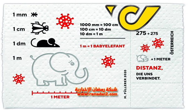 أصدرت الخدمة البريدية بجمهورية النمسا، طوابع على ورق التواليت، يُظهر الطابع صورة لـ”فيل” رضيع، تم استخدامه في النمسا لترمز إلى التباعد الاجتماعى بين الأفراد، والتى يبلغ طولها متر واحد، وهى المسافة المستخدمة فى الدولة الأوروبية لتجنب انتشار الفيروس.تبلغ قيمة الطوابع 2.75 يورو، بالإضافة إلى تكلفة إضافية قدرها 2.75 يورو، حيث تتبرع خدمة البريد بنصف السعر لمساعدة أولئك الذين تضرروا بشدة من فيروس كورونا.