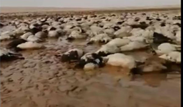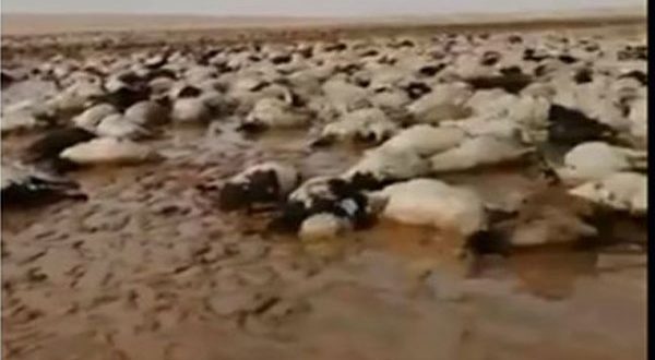 وأظهر مقطع الفيديو، قطيع الغنم التي يتجاوز عدد رؤوسه أكثر من 1000 وهي على الأرض نافقة في المياه، بعد أن داهمت السيول المنطقة التي كانت فيها.