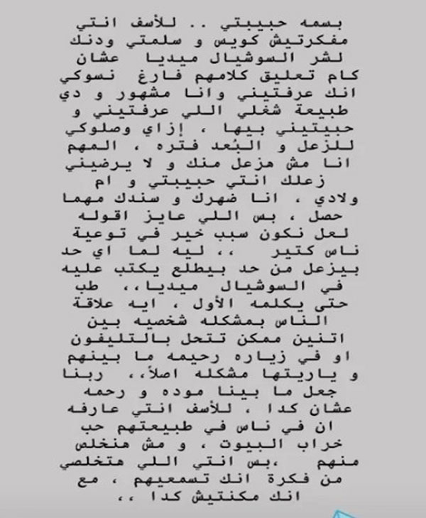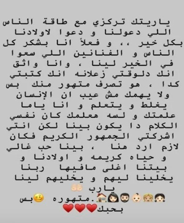واستكمل : ياريت تركزي مع طاقة الناس اللي دعولنا ودعول لاولادنا بكل خير وفعلا انا بشكر كل الناس والفنانين اللي سعوا في الخير لينا وانا واثق انك زعلانة انك كتبتي كدة، هو تصرف متهور منك ولا يهمك مش عيب ان الانسان يغلط ويتعلم وانا ياما علمتك ولسة هعلمك كان نفسي الكلام ده يكون بينا”.