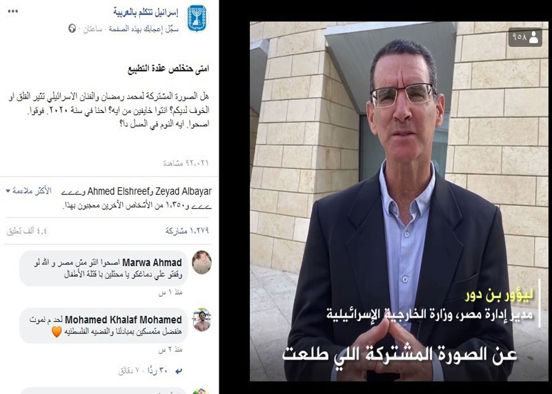 ونشرت صفحة «إسرائيل تتحدث العربية» التابعة لوزارة الخارجية الإسرائيلية، اليوم الأربعاء، مقطعا مصورا لأحد الدبلوماسيين في الوزارة يستهجن فيه ردود الأفعال الشعبية المصرية على صور حديثة للفنان محمد رمضان مع ثلاثة شخصيات عامة إسرائيلية.