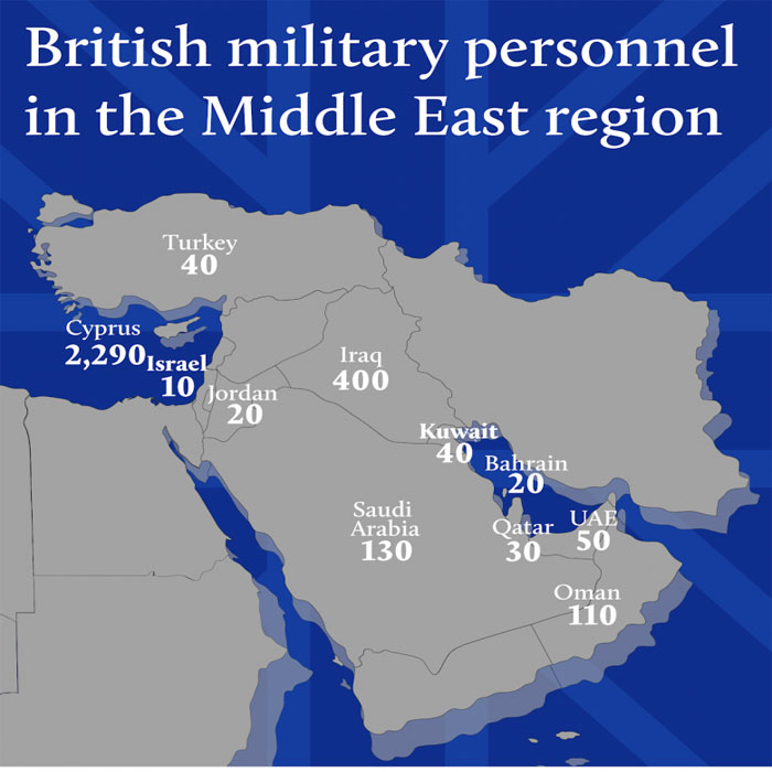 نشر موقع «ميدل إيست آي» الإخباري مقالًا للكاتب إيان كوبين تناول فيه انتشار القوات البريطانية في عشرات المواقع بجميع أنحاء الشرق الأوسط، موضحًا أن أحد مواقع الصحافة الاستقصائية توصَّل إلى أن القوات البريطانية تمتلك 23 قاعدة وأفرادًا عاملين في المملكة العربية السعودية، والعراق، والأردن، ودول الخليج، والسفارة الأمريكية في القدس.