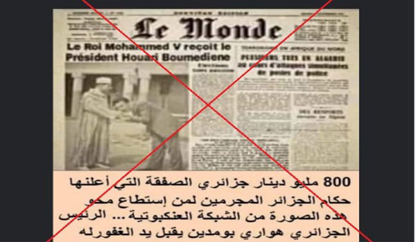 إلا أن الصورة لا تظهر الرئيس الجزائري الأسبق هواري بومدين مقبلا يد الملك محمد الخامس، حيث تبين أن الصورة معدلة، والأصلية منها منشورة في تقارير عن المغرب، يظهر فيها كما ورد في التعليق المرافق لها “ولي العهد مولاي الحسن وهو يقبل يد والده محمد الخامس عام 1950.