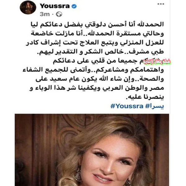 وكتبت عبر صفحتها بموقع فيس بوك: الحمد لله أنا أحسن دلوقتي بفضل دعائكم ليا وحالتي مستقرة الحمد لله.. أنا مازلت خاضعة للعزل المنزلي وبتبع العلاج تحت إشراف كادر طبي مشرف.
