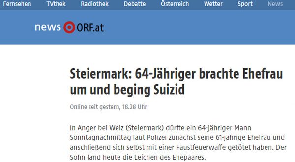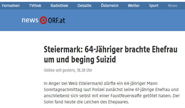 أقدم نمساوى اليوم الأثنين ظهراّ الموافق 18 من يناير 2021 ،على قتل زوجته البالغة من العمر 61 عاماّ بطلق نارى من مسدسة المرخص عيار تسعة ملليمترات ، ثم أقدم على الانتحار بإطلاق النار على نفسة