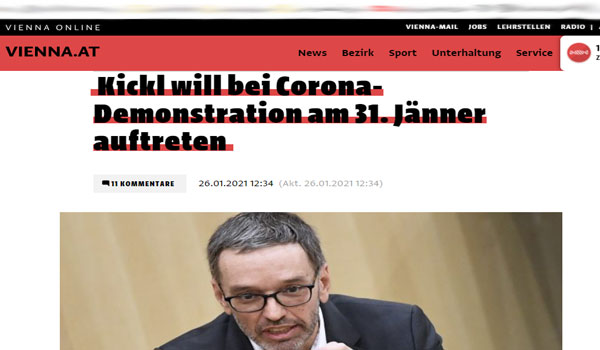 دعا حزب الحرية الشعبوى النمساوى إلى تظاهرة يوم 31 من يناير بقلب العاصمة النمساوية قيينا ، في ساحة ماريا تريزا بلاتس ” Maria-Theresien-Platz” رغم المخاوف من تبعات المظاهرات، التي يشارك فيها الآلاف في عدة مدن نمساوية احتجاجاً على الإجراءات المتعلقة بكورونا ويعتقد أن اليمين الشعبوي يستغلها، إلا أن الاستطلاعات تظهر إرتفاع ثقة غالبية النمساويين بالسلطات والسياسات الخاصة بالتصدى لقيروس كورونا.