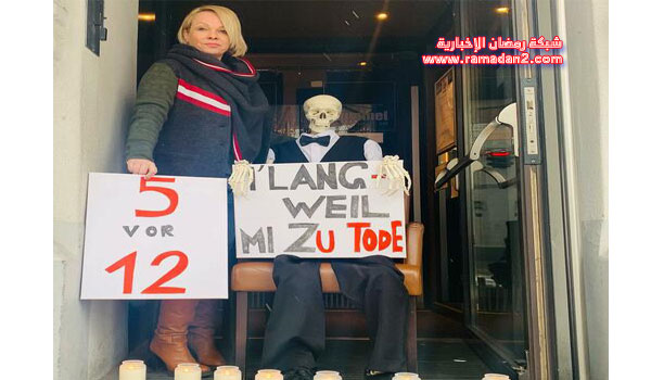 “ملل قاتل”عند مدخل المقهى الشهير بالحى الثامن في فيينا “Josefstädter Straße 66” يعبر هيكل عظمي بلباس نادل يحمل هذه اللافتة، عن حالة مديرته كريستينا هومل.