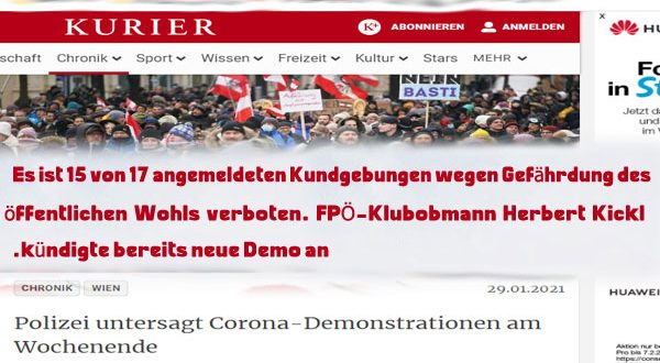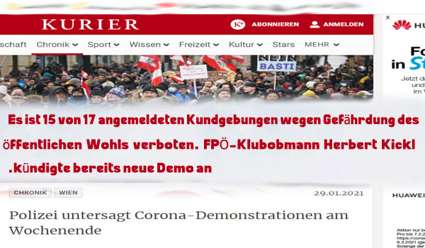 حظرت سلطات العاصمة النمساوية فيينا عددًا من المظاهرات كان من المفترض تنظيمها في نهاية الأسبوع الحالى، ضد لوائح الدولة بشأن كورونا، والتي دعا إليها حزب الحرية الشعبوى اليمينى وعدد من المنظمات الأخرى ، ومن بين 17 مظاهرة مسجلة ، حظرت الشرطة 15 مظاهرة. وقالت الشرطة أن ليست كل المظاهرات الـ 17 موجهة بالطبع ضد سياسة وأجراءات كورونا ، على سبيل المثال تم حظر مسيرة ضد التعديل المثير للجدل لقانون الجامعة (UG).