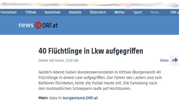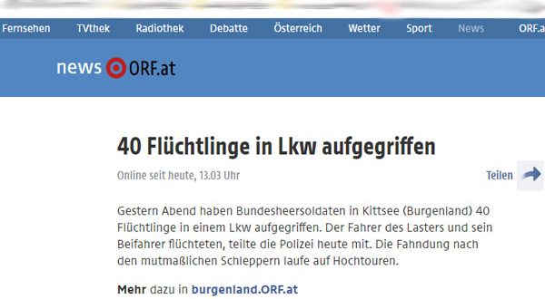 أعلنت الشرطة النمساوية يوم أمس السبت العثور على شاحنة كان بداخلها أكثر من 40 مهاجراً غير شرعي، من جنسيات سورية وفلسطينية وعراقيين ، مكدّسين فوق بعضهم البعض من دون أي تهوية ، حيث كانت الشاحنة في طريقها لعبور الحدود المجرية فى اتجاه النمسا بمقاطعة بورغنلاند التي تقع قى أقصى شرق البلاد.