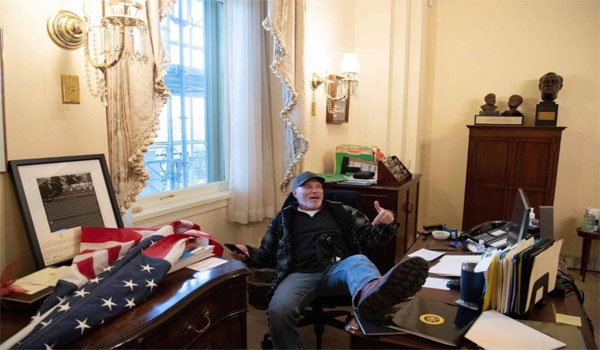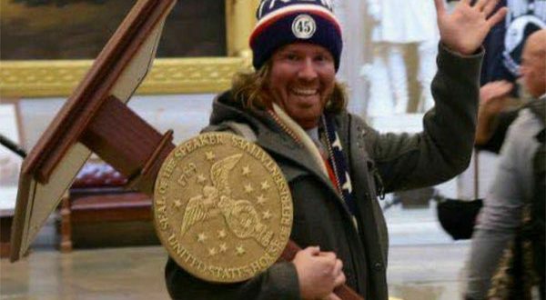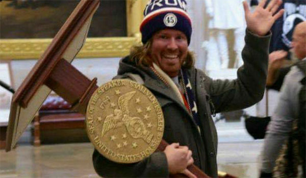 صورة أخرى أثارت موجة من السخرية على الفضاء الافتراضي، كانت لأحد أنصار ترامب وهو يقوم بسرقة منبر مجلس النواب، ملوحاً بشارة النصر، ويظهر بشكل واضح دون أن يخفي ملامحه