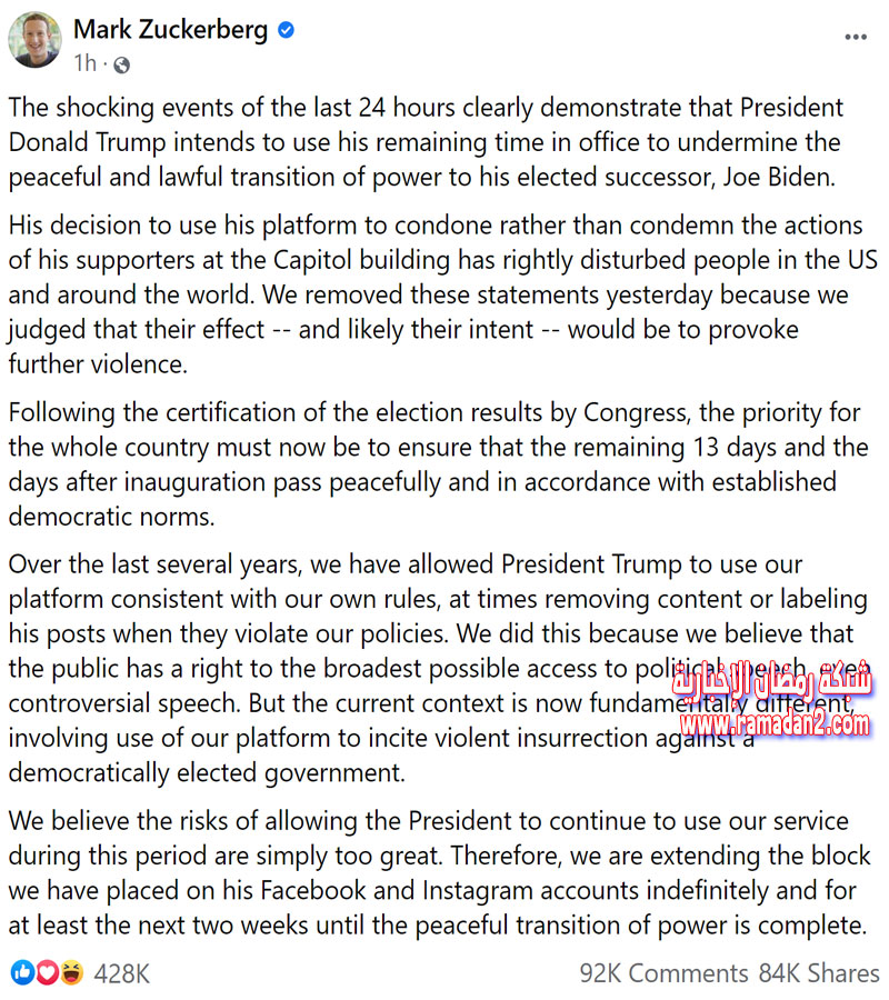 وقال زوكربيرغ في منشور على حسابه في فيسبوك: “نعتبر أن السماح للرئيس بمواصلة استخدام خدماتنا خلال هذه الفترة ينطوي على مخاطر كبيرة للغاية”.