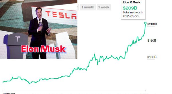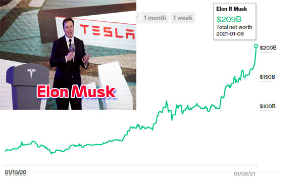 في يناير 2020 احتفل إيلون ماسك بالعام الجديد بثروة قدرها 28 مليار دولار، لكن في نهاية الأسبوع الأول من هذا العام قفزت ثروته 10 أضعاف ما كانت عليه قبل عام، ووصلت 209 مليار دولار أمريكي ليصبح أغنى أغنياء العالم 2021، متخطيًا الرئيس التنفيذي لشركة «أمازون» جيف بيزوس الذي تربع على عرش أغنى رجل في العالم منذ عام 2017 وحتى الأسبوع الأول من العام الحالي!