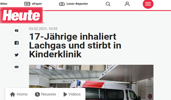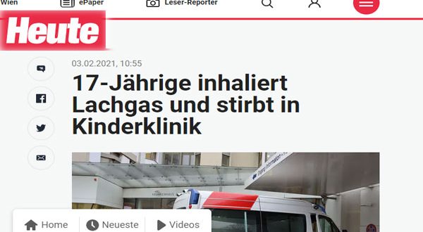 توفيت فتاة في مدينة جراتس النمساوية ، تبلغ من العمر 17 عاماّ ، جراء استنشاقه غاز البيوتان الذي يسبب الضحك وتغيير الصوت ، وأدى استنشاق الغاز إلى كتم أنفاس الفتاة مباشرة ، مما حدث لها أنهيار وفقدان الوعى