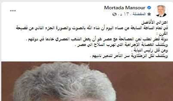 وغرد مرتضي منصور من خلال حساباته الشخصية على مواقع التواصل الاجتماعي “فيسبوك” و”إنستجرام” و”تويتر”، قائلًا: “اعزائي الأفاضل في تمام الساعة السابعة من مساء اليوم الجزء الثاني من فضيحة القرن ، دولة قطر تطلب ثمن المصالحة مع مصر هو أن يعمل الشعب المصري خادما في دولتهم”.