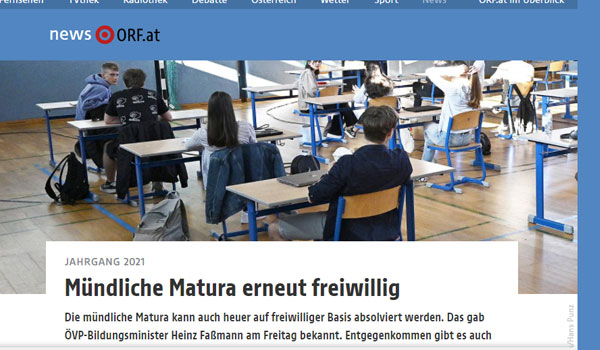كشف هاينز فاسمان ، وزير التربية والتعليم النمساوى اليوم الجمعة الموافق 12 من مارس 2021 ، عن نظام الامتحانات للثانوية العامة “الماتورا” 2020/2021، كما في العام السابق ، خيث أنه يعتمد على الحرية الكاملة للطلاب في أختيار ما أذا كانوا يريدون تأدية الأمتحان شفوياّ في خمسة مواد ، ومادة واحدة تكون تحت بند واجب منزلى ” Schularbeit geben”