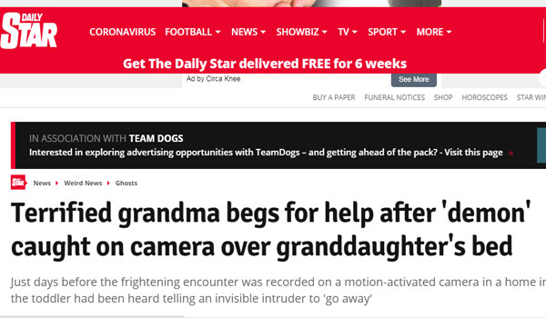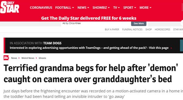 وبعد أيام، تفاجأت الجدة عند فحص اللقطات التي صورتها الكاميرا بشخصية بـ “قرون” ذات “مخالب طويلة” تقف على مقربة من الطفلة الصغيرة النائمة وشقيقها مايكل ماكنزي البالغ من العمر سبعة أشهر.