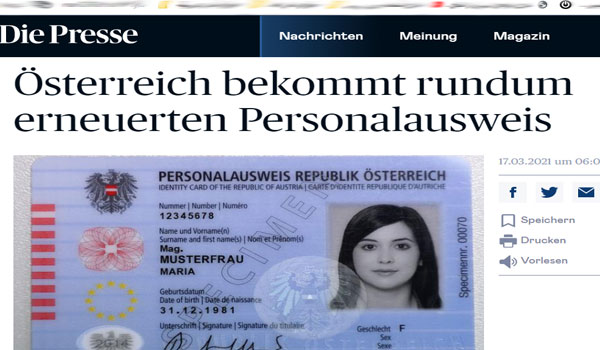 نشرت صحبفة الدى برسة النمساوية اليومية اليوم الأربعاء الموافق 16 من مارس 2021 ، أن السلطات النمساوية تنوى أصدار بطاقات شخصية وجوازات سفر جديدة لمواطنيه بمعايير جديدة تجعلهم غير قابلين للتزوير ، حسب شروط ومطالب الاتحاد الأوروبي بالوصول إلى مستوى أعلى من الحماية ضد التزوير