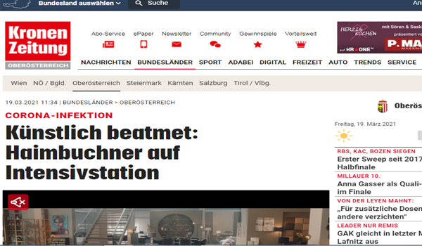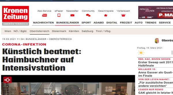 ذكرت الصحف النمساوية الصادرة اليوم الجمعة 19 من مارس 2021 ،أن رئيس حزب الحرية اليمينى النمساوى FPÖ ونائب حاكم ولاية النمسا العليا السيد “ Manfred Haimbuchner” منفيرد هايمبوخر أصيب بفيروس كورونا ، وفى حالة غيبوبة وخطرة بالعناية المركزة على أجهزة التنفس الصناعى ، بمستشفى مدينة لينز العام