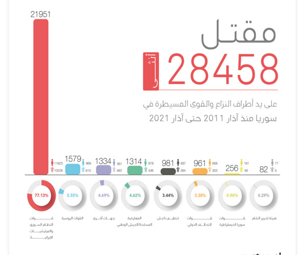 مع إتمام الثورة السورية عقدها الأول، سجلت «الشبكة السورية لحقوق الإنسان»، مقتل 28485 أنثى على يد أطراف النزاع والقوى المسيطرة في سوريا، منذ مارس (آذار) 2011 حتى مارس 2021، بينهن 21943 قتلن على يد قوات النظام السوري، و1579 على يد القوات الروسية، و980 على يد تنظيم «داعش»، و82 على يد هيئة تحرير الشام.