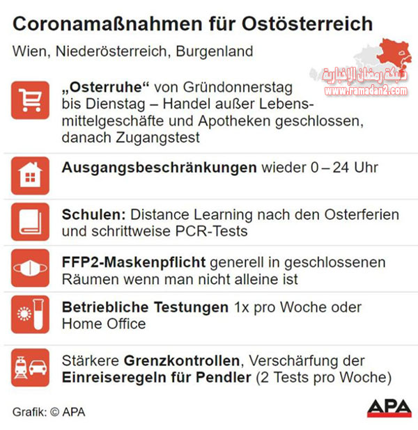 أعلن حكام مقاطعات فيينا وبورغنلاند والنمسا السفلى، عن اتفاقهم على اجراءات موحدة في عطلة عيد الفصح القادم، تهدف للحد من انتشار فايروس كورونا المستجد كوفيد-19 والسلالات المتحورة منه.