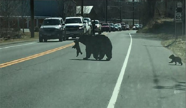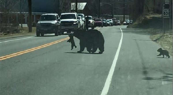 ديسمان من الصغار، عرقلا محاولات الأم عبور الشارع على مرأى من للشرطة التي أوقفت أيضا سيارتها لتراقب ما يحدث، فإذا بالدبة الأم تمسك بأحد الصغار من رقبته وتمشي عابرة الطريق إلى الجهة المقابلة، فتبعها شبل آخر، بينما بقي الاثنان في الخلف، وحين لاحظ أحدهما أن الأم غادرت، لحق بها أيضا، لكنه عاد وشق طريقه عبر الطريق عندما وجد شقيقه يتسلق عمودا بالقرب، فاضطرت “ماما” الدببة للحاق به وعبور الطريق مرة أخرى لتأتي بمتسلق العمود بشكل خاص، إلا أن أحد الصغار غادر خلفها وتبعها.