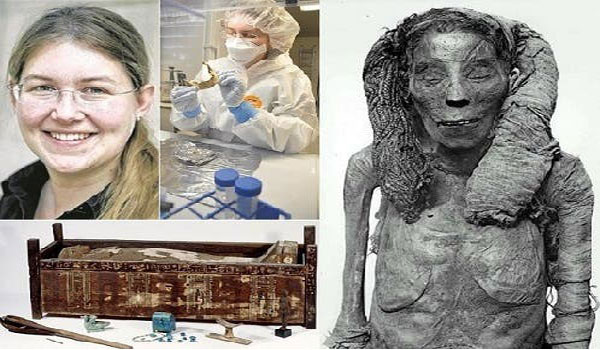 الدكتورة فيرينا شونمان في صورتين، وفي الأسفل تابوت لمومياء تم تحليل حمضها النووي