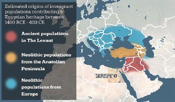 خارطة من الدورية العلمية تشرح الأصل الشرق أوسطي جينيا للفراعنة ونسبته