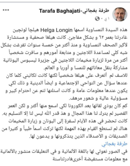 ونشر الناشط الحقوقي والكاتب النمساوي من أصول سورية “طرفة بغجاتي” على صفحته في فيسبوك  باللغة الألمانية “أخبار حزينة.. غادرتنا هيلجا ولكن شجاعتها والتزامها سوف تبقى”.