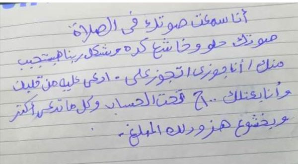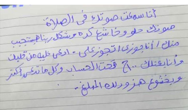 وعندما فتح الإمام ويدعى أحمد زيدان، اللفافة وجد رسالة ومعها مبلغ مالي قدره 100 جنيه، كتب فيها: “ادعي على زوجي أنا سمعت صوتك في الصلاة، صوتك حلو وخاشع وشكل ربنا هيستجيب منك، أنا جوزي اتجوز عليا، ادعي عليه من قلبك وأنا بعتلك 100 جنيه تحت الحساب، وكل ما تدعي أكتر وبخشوع هزودلك المبلغ”.