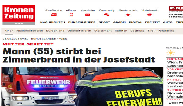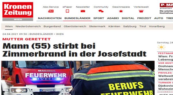 توفي شخص يبلغ من العمر 55 عاماّ مساءّ أمس الجمعة الموافق 23 من أبريل أثر حريق داخل المنزل في فيينا بالحى السادس عشر بشارع “Lerchenfelderstrasse ” بالرغم من محاولة ثلاثة ضباط شرطة إنقاذ الرجل من الخطر عند وصولهم إلى المكان مما جعل أثنين منهم يعانوا من استنشاق الدخان ونقلوا إلى المستشفى للعلاج ، حسبما أفاد المتحدث باسم شرطة فيينا السيد ” Christopher Verhnjak” كريستوفر فيرهنجاك.