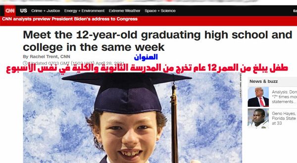 يستعد طفل أميركي في ربيعه الـ 12 للتخرج من المدرسة الثانوية والكلية بالأسبوع ذاته، بعد أن طبق مقولة “اصنع من الليمون شرابا حلوا”، وساعده التوقف عن الذهاب إلى المدرسة إثر تفشي فيروس كورونا على مضاعفة جهوده لمذاكرة عدد أكبر من المواد.