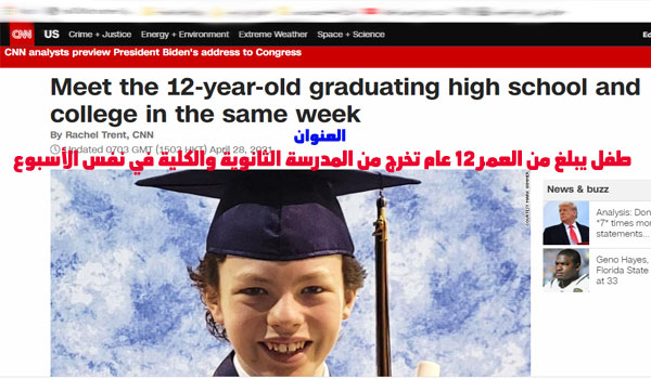 وأفاد الطفل الأميركي بأنه كان يأخذ فصولا دراسية مزدوجة خلال العام الماضي، وأنه رأى أنه بالوتيرة التي يسير بها، كان يحتاج فقط إلى عدد قليل من الفصول للحصول على درجة الزمالة بعد تخرجه من المدرسة الثانوية.