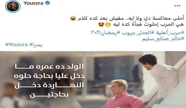 غازلت الفنانة المصرية يسرا زوجها خالد صالح سليم، الذي ظهر معها في مشهد كضيف شرف الحلقة السابعة عشرة، أمس الخميس، في مسلسل “حرب أهلية”، معتبرة أنه قام بتهدئة الحرب الدائرة عبر أحداث المسلسل، بعد أن ظهر بدور والد صديق ابنتها “تمارا” التي تؤدي دورها الفنانة “جميلة عوض”.