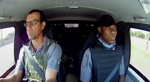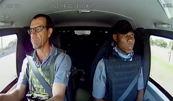 يُظهر مقطع الفيديو، الذي استغرق 3 دقائق، فرد أمن يقود السيارة مع زميله، وكلاهما يرتدي سترة واقية من الرصاص.