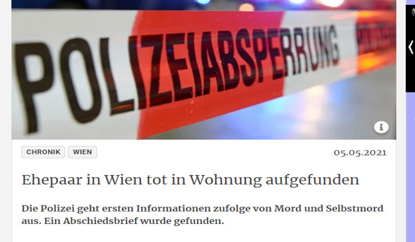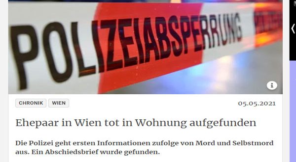 في واقعة مأساوية شهدها الحى السادس عشر – فيينا ، عثرت الشرطة النمساوية اليوم الأربعاء في الصباح الباكر على جثة زوجين مسنين في منزلهما بالعاصمة فيينا إثر انتحارهما بعد معاناتهما الكبيرة مع مرض يقال أنه حسب ما ورد في الصحف المحلية