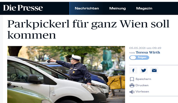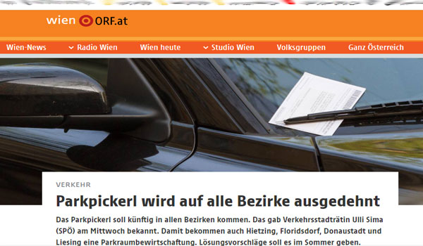 تنوى حكومة فيينا أصدار قرار رسمى على أن يكون كل أحياء العاصمة الـ 23 وقوف السيارات فيها مقابل رسوم ” Parkpickerl – kurzparkzone”، هكذا أعلن اليوم الأربعاء عضو مجلس المدينة أولي سيما ” Ulli Sima” ولكن لم تمنح كل أحياء فيينا موافقتها بعد