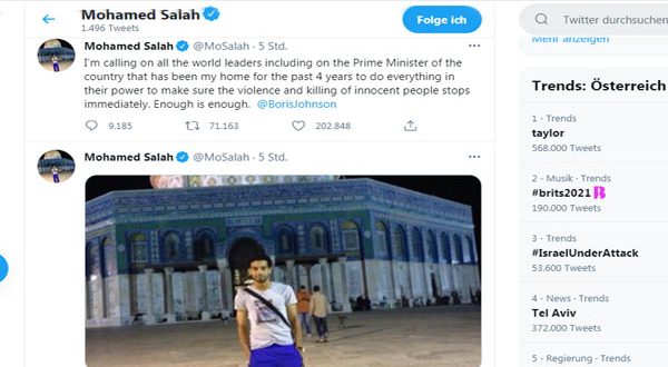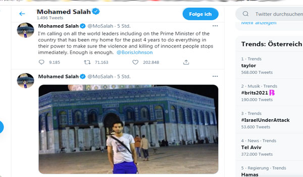 ونشر صلاح صورة له أمام المسجد الأقصى، معلقًا:””إنني أدعو جميع قادة العالم، بما في ذلك رئيس وزراء البلد الذي كان موطنًا لي طيلة السنوات الأربع الماضية” بوريس جونسون”.. إلى بذل كل ما في وسعهم للتأكد من توقف العنف وقتـل الأبرياء على الفور. لقد طفح الكيل.”