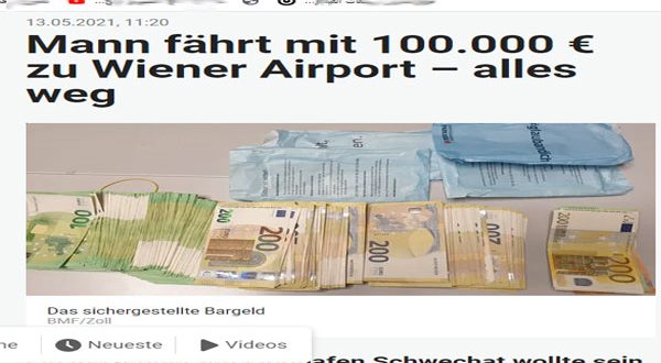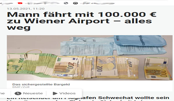 تشرت جريدة هويتة اليومية ، اليوم الخميس 13 من مايو ، أن سلطات الجمارك بمطار فيينا أحبطت يوم الجمعة الماضى ، محاولة لتهريب 100 ألف إيرو مع مساقر مصري مقيم في مدينة حراتس ومتجه إلى القاهرة