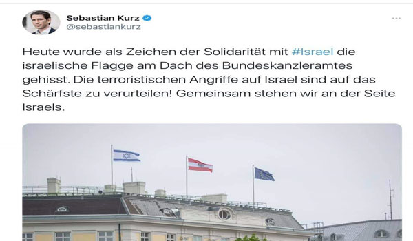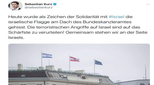 وكتب كورتز على تويتر: “رفع العلم الإسرائيلي اليوم فوق مبنى مكتب المستشار الفيدرالي تضامنا مع إسرائيل”.