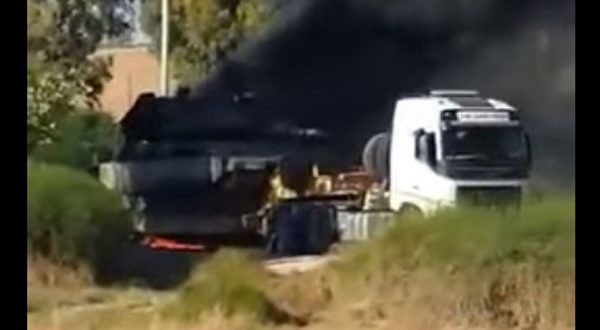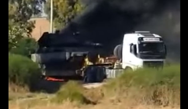 وثق مقطع فيديو متداول على مواقع التواصل الاجتماعي، لحظة استهداف دبابة إسرائيلية على ناقلة أثناء عملية نقلها إلى حدود قطاع غزة.