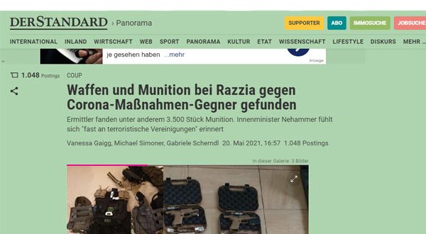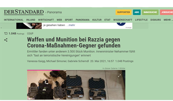 قالت وزارة الداخلية في النمسا إن الشرطة صادرت عدداً من البنادق والسيوف وكمية من الذخيرة خلال مداهمة على مجموعة من الرجال الذين يعارضون إجراءات الحد من تفشي فيروس كورونا، وتردد أنهم كانوا يعتزمون مهاجمة رجال الشرطة.