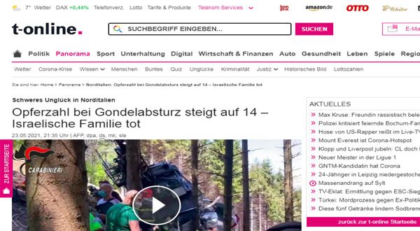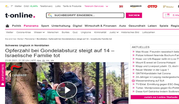 اتضح من بيان أصدرته الخارجية الاسرائيلية، أن 5 سياح اسرائيليين، كانوا بين 14 شخصا لقوا حتفهم بسقوط عربة “تلفريك” في القسم الايطالي من جبال الألب أمس الأحد، في حادث أصاب 2 بجروح، أحدهما طفل اسرائيلي أيضا، وحالته حرجة، فيما لم يتم التأكد بعد من جنسيات بقية الضحايا.