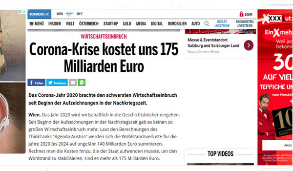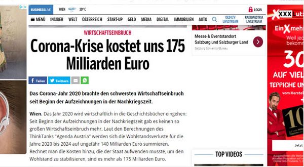 ذكر تقرير اقتصادي صادر عن مؤسسة “النمسا” للتحليلات الاقتصادية، اليوم الاثنين، أن أزمة كورونا تكلف الاقتصاد في البلاد 175 مليار يورو.