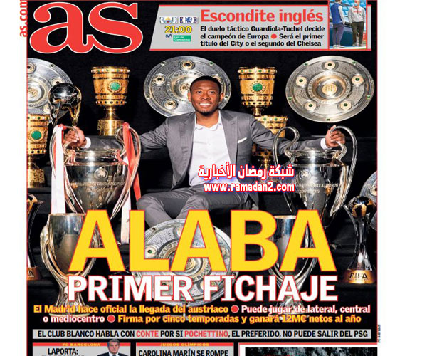 فيما جاء علي رأس صحيفة “آس، عنوان ” ألابا، الانتقال الأول، أعلن ريال مدريد رسميًا عن وصول نجم النمسا ديفيد ألابا مجانًا كأول انتقال له هذا الصيف”.